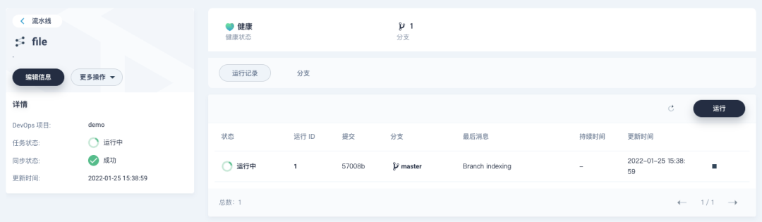 分支进入分支详情页面,不管运行成功还是失败都可以进一步点击「运行 ID」一栏中的序号来查看详细的运行日志及制品等。