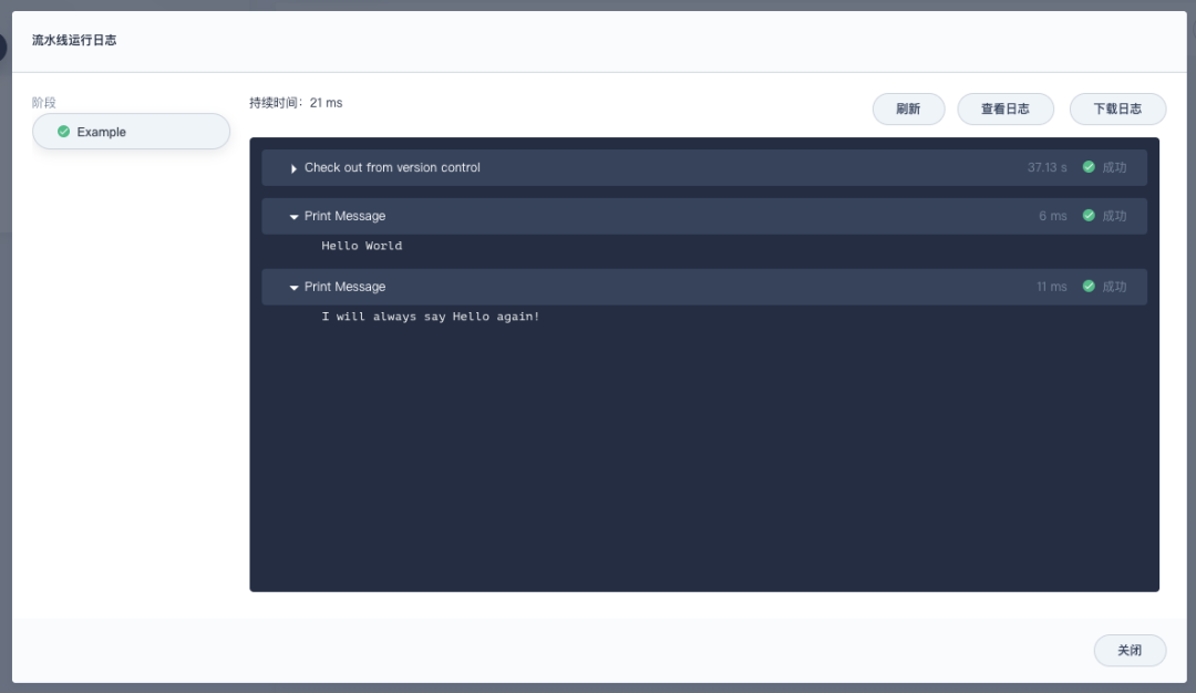 运行成功后可以再次查看流水线运行记录,并查看运行日志,得到如下图所示结果。