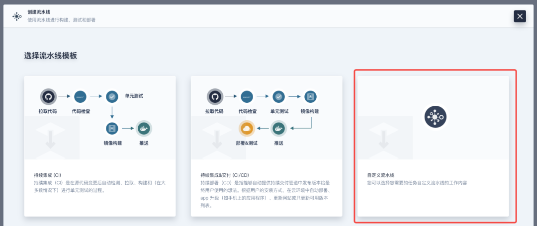 进入流水线详情页面后,我们可以在右侧面板看到「编辑流水线」的按钮,点击后在弹出的「选择流水线模版」对话框中,我们选择自定义流水线
