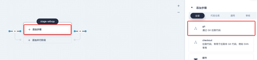 接着我们点击左侧阶段块上的「+ 添加步骤」,并在右侧刷出的「添加步骤」面板中选则git