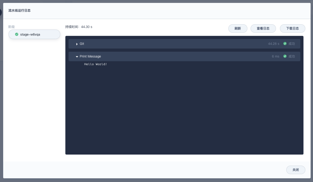 的运行记录可以看到如下图展示的界面。进一步我们可以点击右上角的「查看日志」按钮来了解详细的流水线执行情况。