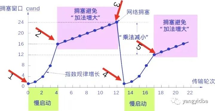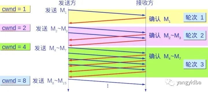 每经过一个传输轮次,拥塞窗口 cwnd 就加倍。一个传输轮次所经历的时间其实就是往返时间RTT。不过“传输轮次”更加强调:把拥塞窗口cwnd所允许发送的报文段都连续发送出去,并收到了对已发送的最后一个字节的确认。