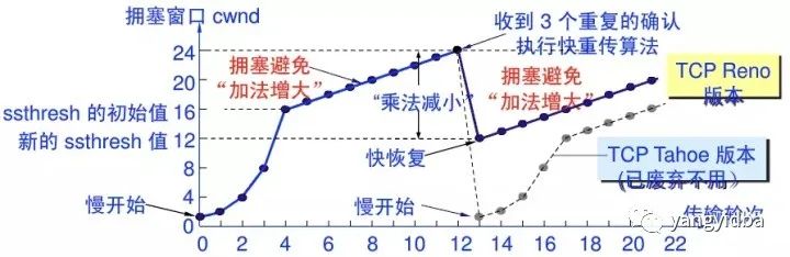 与慢开始不同之处是现在不执行慢开始算法(即拥塞窗口cwnd现在不设置为1),而是把cwnd值设置为 慢开始门限ssthresh减半后的数值,然后开始执行拥塞避免算法(“加法增大”),使拥塞窗口缓慢地线性增大。