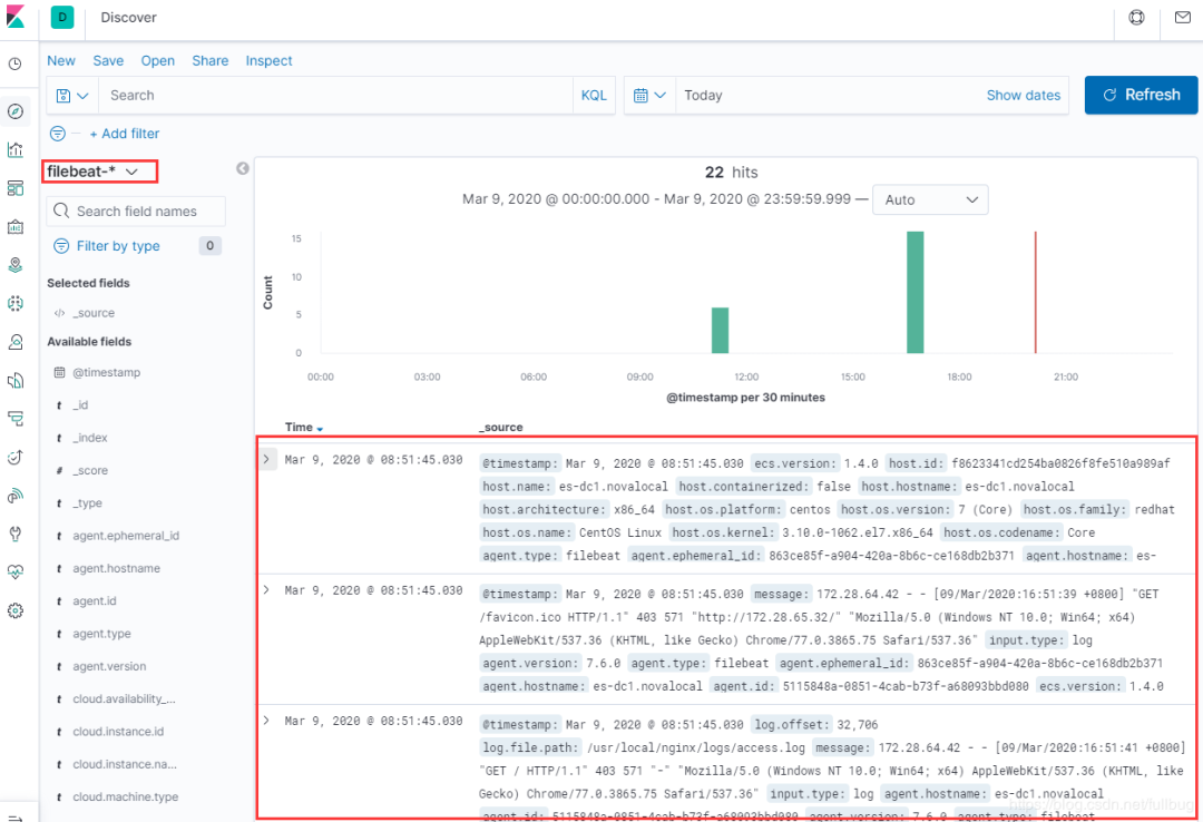 在kibana中通过filebeat-*过滤看filebeat的索引,可以看到通过filebeat采过来的数据。