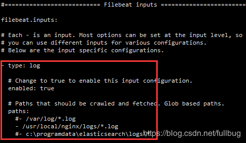 - type: log# Change to true to enable this input configuration.enabled: true# Paths that should be crawled and fetched. Glob based paths.paths:#- var/log/*.log- usr/local/nginx/logs/*.log#- c:\programdata\elasticsearch\logs\*