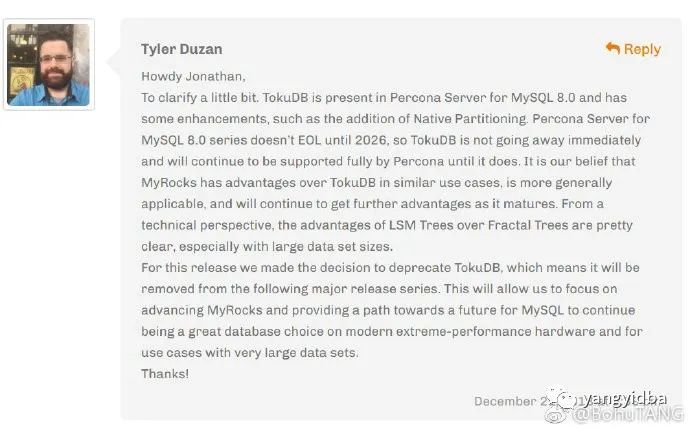 大概的意思是 MyRocks 比TokuDB更有优势,基于此(此处省略几百字),Percona 放弃了收购没几年的TokuDB,Percona Server 8.0 会放弃对Tokudb的支持。