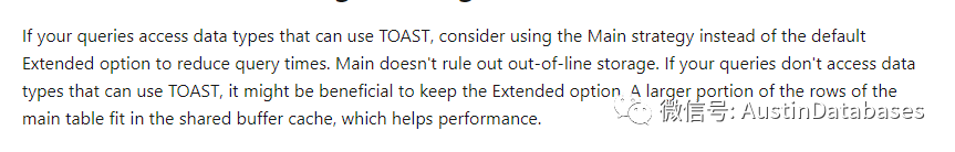 5 TOAST 的在存储数据的时候有四种模式 plain (不使用toast) extended (默认压缩,既要压缩,也要行外存储)external (不压缩,直接使用行外存储) Main模式(压缩,但行外存储会排在最后的选择范围)