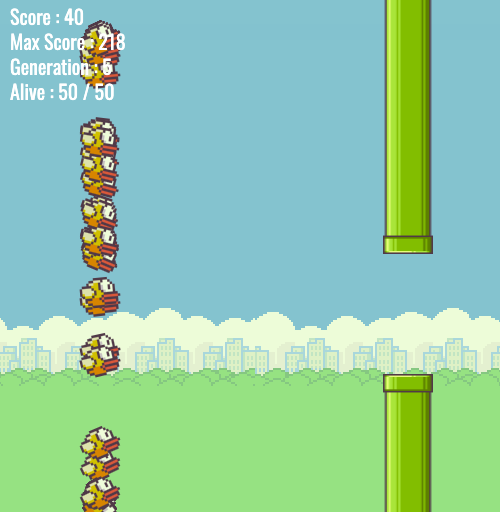 如果算法看到上面需求时,他的思维惯式一般这样的:首先,需要找一款模型,拿 network 为例,可以利用遗传算法来解决上面的问题,具体就是通过 50 代小鸟不断地尝试碰撞,将每一代失败的小鸟的基因记录下来,然后遗传给下一代,形成遗传记忆,这样小鸟就不会以失败的方式过障,以此类推,直到没有失败的小鸟出现,那么成功的基因就训练完毕,这样的一代小鸟就可以完全过障了。