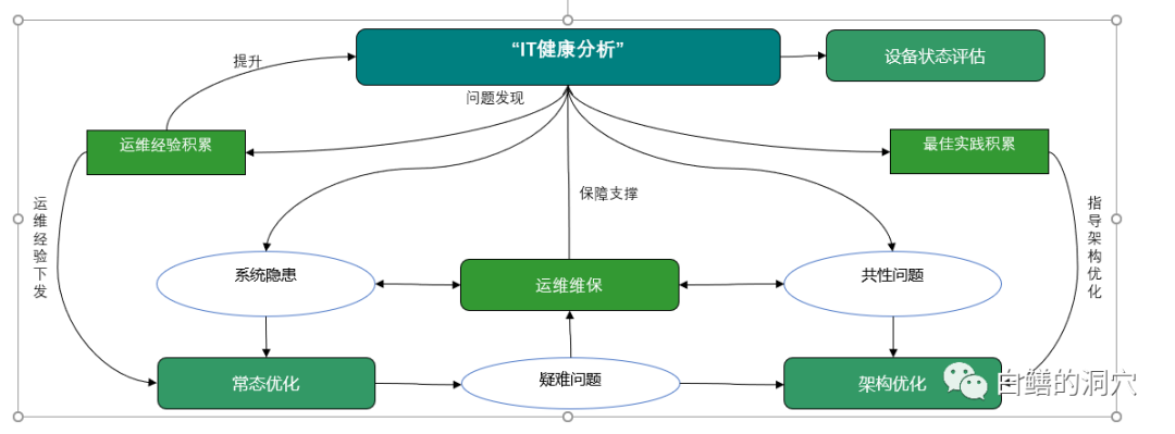 为更好的支撑企业信息化的高速发展,进一步提升运行和安全水平。优化工作应在原有的基础上升级为常态化、全生命周期化模式,从解决问题变成防范问题。实现常态工作、实时响应、闭环管理、全面覆盖的优化工作新模式,构建生态体系,提升系统健康水平和应急处置能力。以IT健康分析为核心,将日常运维、常态化优化、架构优化、设备维保保险、设备状态评估、企业IT设备采购等企业应用与管理场景整合在一起,打通各专业与部门之间的数据壁垒,使用一套数据,一个处理模型,通过数据中台实现数据共享与数据的有效利用。
