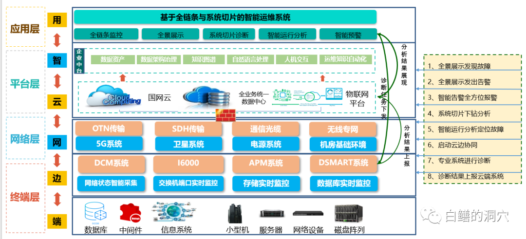 上面是某电力企业基于IT健康管理的理论体系建设的一个“基于全链条监控与系统切片诊断的智能化运维系统”的整体架构图,这个总体架构充分体现了“端边网云智”一体化协同的理念。在端侧是我们的各种运维对象,随着企业信息化的发展,这些对象也在不断的增加,包括云平台,物联网平台,数据中台等也将逐步纳入管理。在边缘侧是一些专业的运维自动化工具与监控采集工具。在云平台和业务中台一侧,则完成数据的存储、共享与深度分析。基于这些基础环境,在上面构建智能化运维的系统。