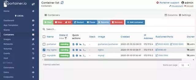 之后就可以看到本机上运行的Docker容器了,点击它们还可以进行容器的管理。左边的条目可以管理卷、创建容器、查看主机信息等等。基本上该有的功能都有了,这也是我推荐的一个工具。