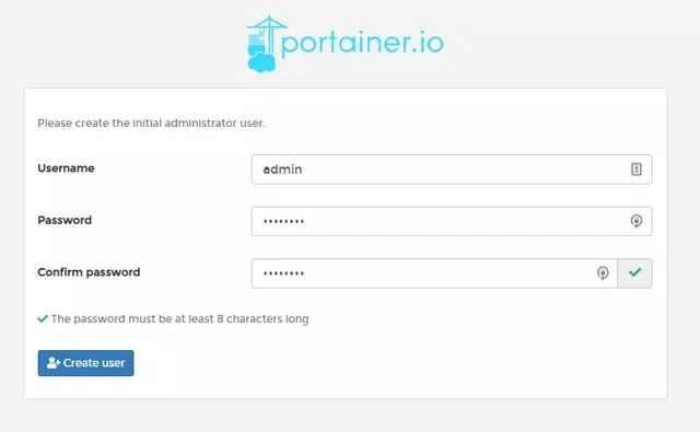 然后在浏览器打开对应地址,就会发现成功运行了。第一次运行的时候需要设置账号,然后选择要管理的Docker主机。