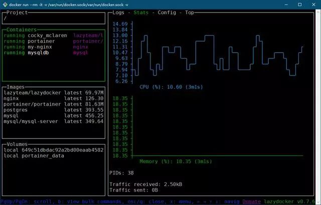 然后就可以在终端中查看Docker容器、镜像和卷的信息了。LazyDocker支持键盘操作和鼠标点击,直接用鼠标点击就可以查看对应信息了。