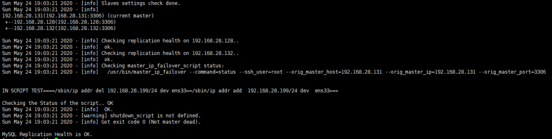 [root@mha3 app1]# masterha_check_repl --conf=/etc/masterha/app1.confSun May 24 17:34:41 2020 - [warning] Global configuration file etc/masterha_default.cnf not found. Skipping.Sun May 24 17:34:41 2020 - [info] Reading application default configuration from etc/masterha/app1.conf..Sun May 24 17:34:41 2020 - [info] Reading server configuration from etc/masterha/app1.conf..Sun May 24 17:34:41 2020 - [info] MHA::MasterMonitor version 0.58.Sun May 24 17:34:42 2020 - [info] GTID failover mode = 0Sun May 24 17:34:42 2020 - [info] Dead Servers:Sun May 24 17:34:42 2020 - [info] Alive Servers:Sun May 24 17:34:42 2020 - [info] 192.168.28.128(192.168.28.128:3306)Sun May 24 17:34:42 2020 - [info] 192.168.28.131(192.168.28.131:3306)Sun May 24 17:34:42 2020 - [info] 192.168.28.132(192.168.28.132:3306)Sun May 24 17:34:42 2020 - [info] Alive Slaves:Sun May 24 17:34:42 2020 - [info] 192.168.28.131(192.168.28.131:3306) Version=5.7.25-28-log (oldest major version between slaves) log-bin:enabledSun May 24 17:34:42 2020 - [info] Replicating from 192.168.28.128(192.168.28.128:3306)Sun May 24 17:34:42 2020 - [info] Primary candidate for the new Master (candidate_master is set)Sun May 24 17:34:42 2020 - [info] 192.168.28.132(192.168.28.132:3306) Version=5.7.25-28-log (oldest major version between slaves) log-bin:enabledSun May 24 17:34:42 2020 - [info] Replicating from 192.168.28.128(192.168.28.128:3306)Sun May 24 17:34:42 2020 - [info] Not candidate for the new Master (no_master is set)Sun May 24 17:34:42 2020 - [info] Current Alive Master: 192.168.28.128(192.168.28.128:3306)Sun May 24 17:34:42 2020 - [info] Checking slave configurations..Sun May 24 17:34:42 2020 - [info] Checking replication filtering settings..Sun May 24 17:34:42 2020 - [info] binlog_do_db= , binlog_ignore_db=Sun May 24 17:34:42 2020 - [info] Replication filtering check ok.Sun May 24 17:34:42 2020 - [info] GTID (with auto-pos) is not supportedSun May 24 17:34:42 2020 - [info] Starting SSH connection tests..Sun May 24 17:34:48 2020 - [info] All SSH connection tests passed successfully.Sun May 24 17:34:48 2020 - [info] Checking MHA Node version..Sun May 24 17:34:49 2020 - [info] Version check ok.Sun May 24 17:34:49 2020 - [info] Checking SSH publickey authentication settings on the current master..Sun May 24 17:34:50 2020 - [info] HealthCheck: SSH to 192.168.28.128 is reachable.Sun May 24 17:34:51 2020 - [info] Master MHA Node version is 0.58.Sun May 24 17:34:51 2020 - [info] Checking recovery script configurations on 192.168.28.128(192.168.28.128:3306)..Sun May 24 17:34:51 2020 - [info] Executing command: save_binary_logs --command=test --start_pos=4 --binlog_dir=/data/mysql3306/data --output_file=/tmp/save_binary_logs_test --manager_version=0.58 --start_file=mysql-bin.000012Sun May 24 17:34:51 2020 - [info] Connecting to root@192.168.28.128(192.168.28.128:22)..Creating tmp if not exists.. ok.Checking output directory is accessible or not..ok.Binlog found at data/mysql3306/data, up to mysql-bin.000012Sun May 24 17:34:52 2020 - [info] Binlog setting check done.Sun May 24 17:34:52 2020 - [info] Checking SSH publickey authentication and checking recovery script configurations on all alive slave servers..Sun May 24 17:34:52 2020 - [info] Executing command : apply_diff_relay_logs --command=test --slave_user='mha' --slave_host=192.168.28.131 --slave_ip=192.168.28.131 --slave_port=3306 --workdir=/tmp --target_version=5.7.25-28-log --manager_version=0.58 --relay_log_info=/data/mysql3306/data/relay-log.info --relay_dir=/data/mysql3306/data/ --slave_pass=xxxSun May 24 17:34:52 2020 - [info] Connecting to root@192.168.28.131(192.168.28.131:22)..Checking slave recovery environment settings..Opening data/mysql3306/data/relay-log.info ... ok.Relay log found at data/mysql3306/data, up to relay-log.000003Temporary relay log file is data/mysql3306/data/relay-log.000003Checking if super_read_only is defined and turned on.. not present or turned off, ignoring.Testing mysql connection and privileges..mysql: [Warning] Using a password on the command line interface can be insecure.done.Testing mysqlbinlog output.. done.Cleaning up test file(s).. done.Sun May 24 17:34:53 2020 - [info] Executing command : apply_diff_relay_logs --command=test --slave_user='mha' --slave_host=192.168.28.132 --slave_ip=192.168.28.132 --slave_port=3306 --workdir=/tmp --target_version=5.7.25-28-log --manager_version=0.58 --relay_log_info=/data/mysql3306/data/relay-log.info --relay_dir=/data/mysql3306/data/ --slave_pass=xxxSun May 24 17:34:53 2020 - [info] Connecting to root@192.168.28.132(192.168.28.132:22)..Checking slave recovery environment settings..Opening data/mysql3306/data/relay-log.info ... ok.Relay log found at data/mysql3306/data, up to relay-log.000003Temporary relay log file is data/mysql3306/data/relay-log.000003Checking if super_read_only is defined and turned on.. not present or turned off, ignoring.Testing mysql connection and privileges..mysql: [Warning] Using a password on the command line interface can be insecure.done.Testing mysqlbinlog output.. done.Cleaning up test file(s).. done.Sun May 24 17:34:54 2020 - [info] Slaves settings check done.Sun May 24 17:34:54 2020 - [info]192.168.28.128(192.168.28.128:3306) (current master)+--192.168.28.131(192.168.28.131:3306)+--192.168.28.132(192.168.28.132:3306)Sun May 24 17:34:54 2020 - [info] Checking replication health on 192.168.28.131..Sun May 24 17:34:54 2020 - [info] ok.Sun May 24 17:34:54 2020 - [info] Checking replication health on 192.168.28.132..Sun May 24 17:34:54 2020 - [info] ok.Sun May 24 17:34:54 2020 - [info] Checking master_ip_failover_script status:Sun May 24 17:34:54 2020 - [info] usr/bin/master_ip_failover --command=status --ssh_user=root --orig_master_host=192.168.28.128 --orig_master_ip=192.168.28.128 --orig_master_port=3306IN SCRIPT TEST====/sbin/ip addr del 192.168.28.199/24 dev ens33==/sbin/ip addr add 192.168.28.199/24 dev ens33===Checking the Status of the script.. OKSun May 24 17:34:54 2020 - [info] O