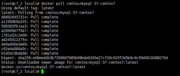 [root@c7_2 local]# docker pull centos/mysql-57-centos7Using default tag: latestlatest: Pulling from centos/mysql-57-centos7d8d02d457314: Pull completea11069b6e245: Pull complete596303fb1aa3: Pull completea29499e779a7: Pull complete17d1a52c2e00: Pull completeed24591227fe: Pull completede0ad46e3ed9: Pull completec62e4a984a9c: Pull complete01d54c6bda68: Pull completeDigest: sha256:e08ee4d43b7356607685b69bde6335e27cf20c020f345b6c6c59400183882764Status: Downloaded newer image for centos/mysql-57-centos7:latestdocker.io/centos/mysql-57-centos7:latest
