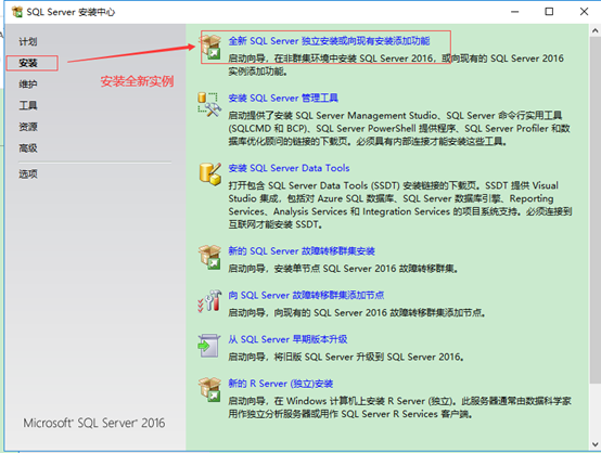 如果需要全新实例的安装,则 按图中选则全新SQL SERVER独立安装或想现有安装添加功能。