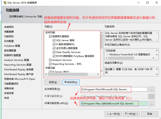 按需选择需要安装的功能,注意此步骤中设计polybase,建议初学者不选择,但是如果有需要用到配合使用Hadoop进行数据分析的进行安装。