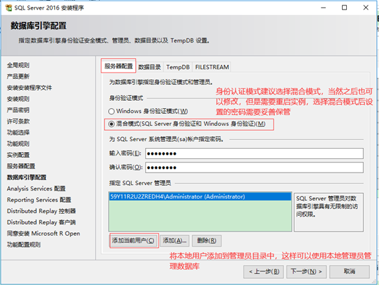身份模式验证:建议选择回合默认,这样使用数据库账号及windows管理员的身份均可进入数据库。此步骤设置管理员(用户名是sa,相当于MySQL的root账号)的密码,记住需要妥善保管。