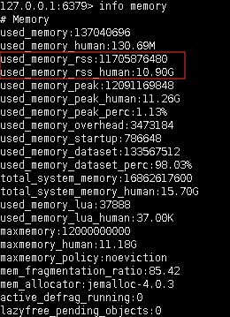 127.0.0.1:6379> info memory# Memoryused_memory:137040696used_memory_human:130.69Mused_memory_rss:11705876480used_memory_rss_human:10.90Gused_memory_peak:12091169848used_memory_peak_human:11.26Gused_memory_peak_perc:1.13%used_memory_overhead:3473184used_memory_startup:786648used_memory_dataset:133567512used_memory_dataset_perc:98.03%total_system_memory:16862617600total_system_memory_human:15.70Gused_memory_lua:37888used_memory_lua_human:37.00Kmaxmemory:12000000000maxmemory_human:11.18Gmaxmemory_policy:noevictionmem_fragmentation_ratio:85.42mem_allocator:jemalloc-4.0.3active_defrag_running:0lazyfree_pending_objects:0