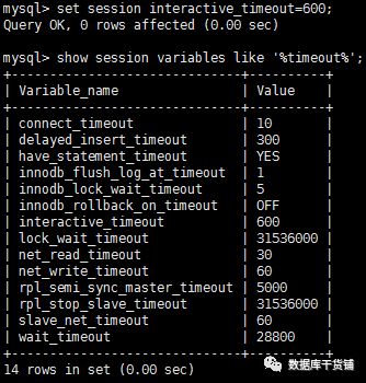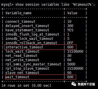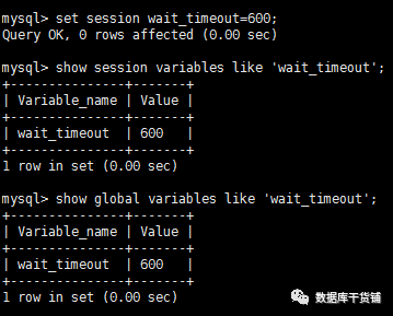 重进后,没设置session级的居然变了,和global级一样的。至此,我们了解到,只要同时修改global级interactive_timeout和wait_timeout才能生效。