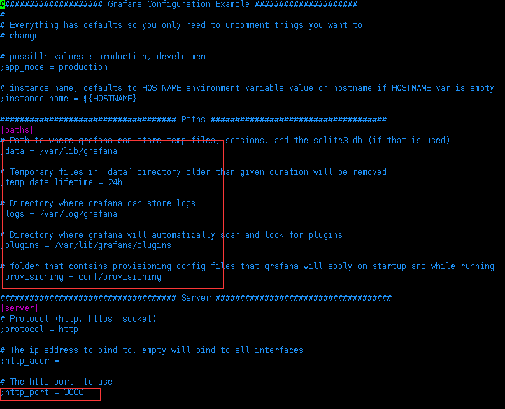 安装完成后,grafana服务默认已安装,配置文件为/etc/grafana/grafana.ini,如需修改路径及端口,可在该文件中修改