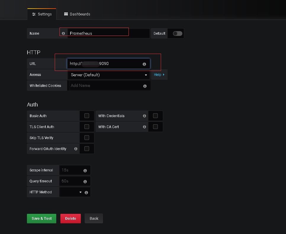 本次使用的均为prometheus数据源,因此配置一个prometheus的数据源