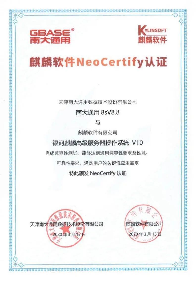近日,GBASE南大通用与麒麟软件有限公司完成产品兼容性测试工作,此次互认证的产品是南大通用自主研发的安全数据管理系统GBase 8s V8.8与银河麒麟高级服务器操作系统V10。经过严格的联合测试,双方产品可以顺利适配、相互良好兼容,运行流畅。