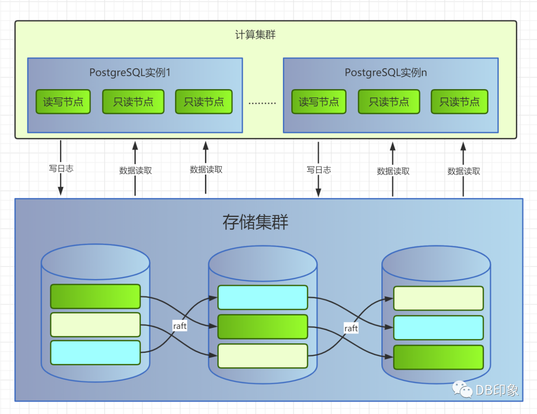 这种架构primary实例的写请求只写日志而不写数据页,redo逻辑下沉到存储节点,Pg实例架构层只处理计算请求,不存储数据,多个实例共享一个存储集群。