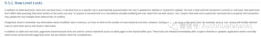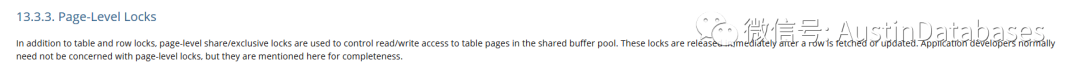 但问题可能有同学提出在PG 9.3 以及以前的版本中并未看到,单独列出的 page level locks 这个单独的项目,但实际仔细的查找之前的版本的 page level locks 是在 Row-level locks 这个项目中,并且从早期的9.x写到现在的PG12 都是一句话带过