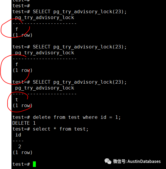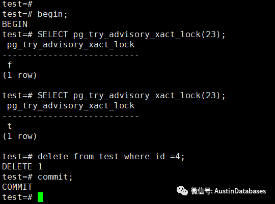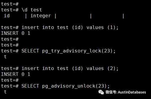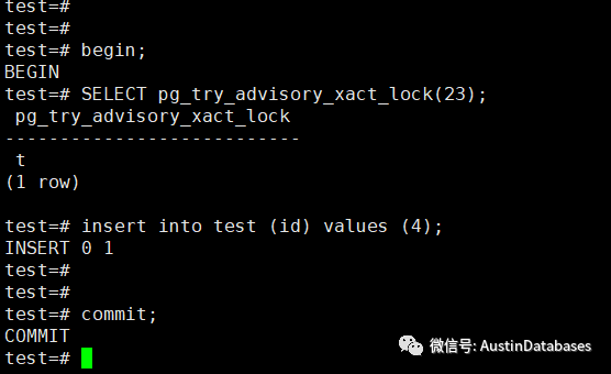 下面是一个事务的例子,并发的时候transaction 2,无法获知到底transaction1到底是不是将ID =4 插入到 TEST 表中,所以通过pg_try_advisory_xact_lock 来阻止 transactoin 2 程序出错,这也是一种使用advisory_lock的方式。