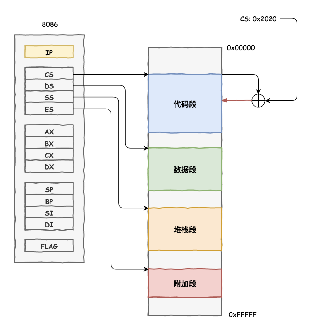 但是祖先的寄存器都是 16 位的啊,只能存放 16 位的地址。不过他们很聪明,发明了一个叫分段式存储管理的方法,把内存划分为最大 64KB 的小块,为什么是 64KB 呢,因为 16 位地址最多只能寻址这么大了。