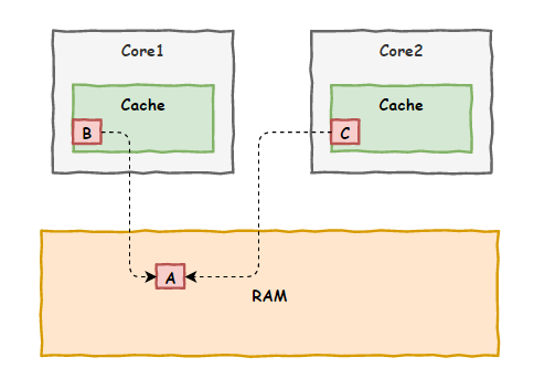 接下来,老 K 把事情的经过告诉了我。原来,我们两个 CPU 车间各自负责的线程都在执行一个 i++ 的操作,我们都把i的值放到了自己的缓存中,完了之后都没有通知对方,加了两次但结果却只有一次,出现了数据不一致问题。