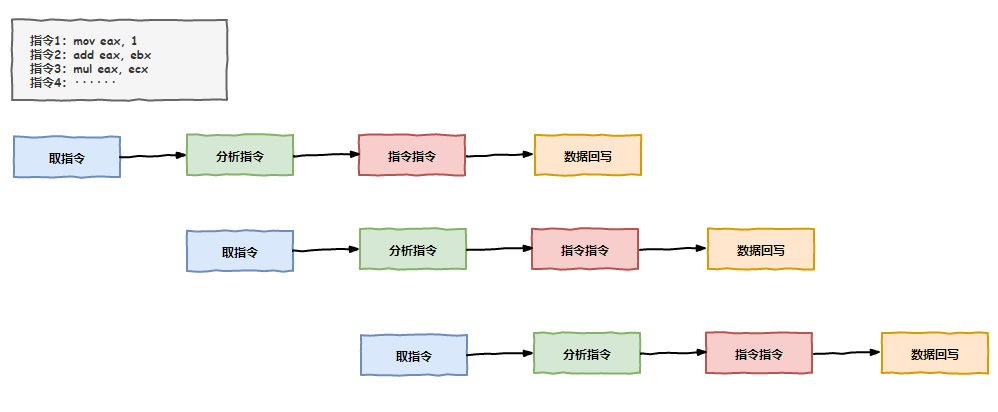 老 K 听后很赞赏我的思路,并补充到:“不仅是准备工作,像有些指令,比如加法,如果参与加法的数据不依赖前面指令的结果,咱们完全可以提前把这加法指令执行了嘛,把结果保存在缓存中,等真正轮到这条指令执行的时候,再把缓存中的结果写到内存中,这不也是节约了时间吗?”