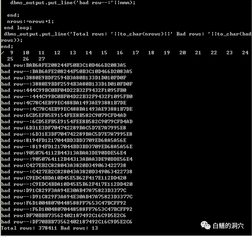 dbms_output.put_line('Total rows:'||to_char(nrows)||' Bad rows: '||to_char(badrows));