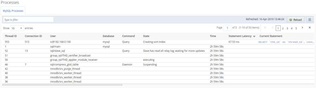 监视正在运行语句的执行过程。可以通过用户、查询、命令, 状态等信息进行过滤检索,并且可以自定义显示输出内容。