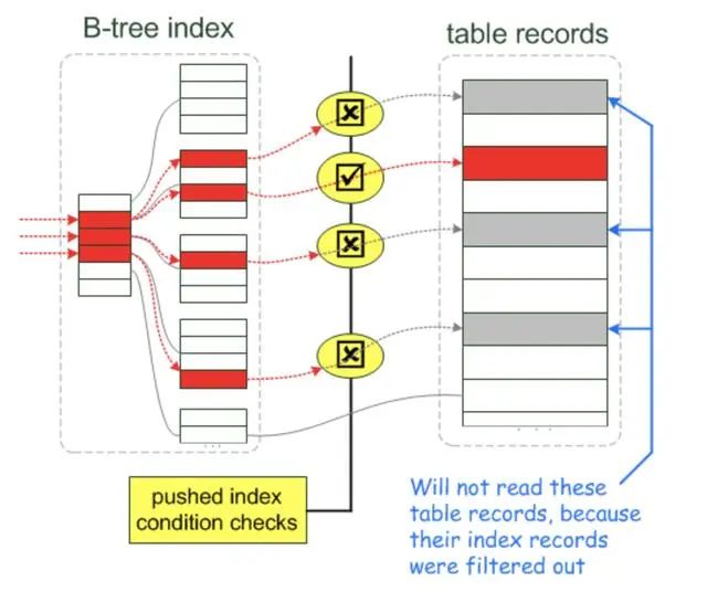表扫描(Table scan)下推对 MySQL DBA并不陌生,MySQL 5.6 推出 Index Condition Pushdown(简称ICP)特性。未启用ICP特性时,会按照第一个索引条件列到存储引擎查找数据,并把整行数据提取到实例层,实例层再根据Where后其他的条件过滤数据行。启用ICP特性后,如果Where条件中同时包含检索列和过滤列,且这些列上创建了一个多列索引的情况下,那么实例层会把这些过滤列同时下推到存储引擎层,在存储引擎层过滤掉不满足的数据,只读取并返回需要的数据,减少存储引擎层和实例层之间的数据传输和回表请求,通常情况下可以大幅提升查询效率。下图可以很直观的看到ICP启用前后的数据链路: