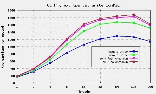 直接提升TPS,以 MariaDB(MySQL 分支) 为例.关闭 Double Write 能带来30%左右的提升,如下图所示: