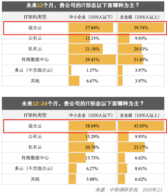下面在看看未来的一些趋势,上图是来自中桥调研机构在2020Q1所做的一份调研。其可看到在未来的一到两年,以混合云、公有云、多云形态将逐渐增加,而私有云、数据中心方式将逐渐减少。这也是企业在多年实践云之后,理性的一种选择。传统的私有云或自建方式的问题,已经被越来越多的企业看到,并更加理性地选择合适的基础架构。