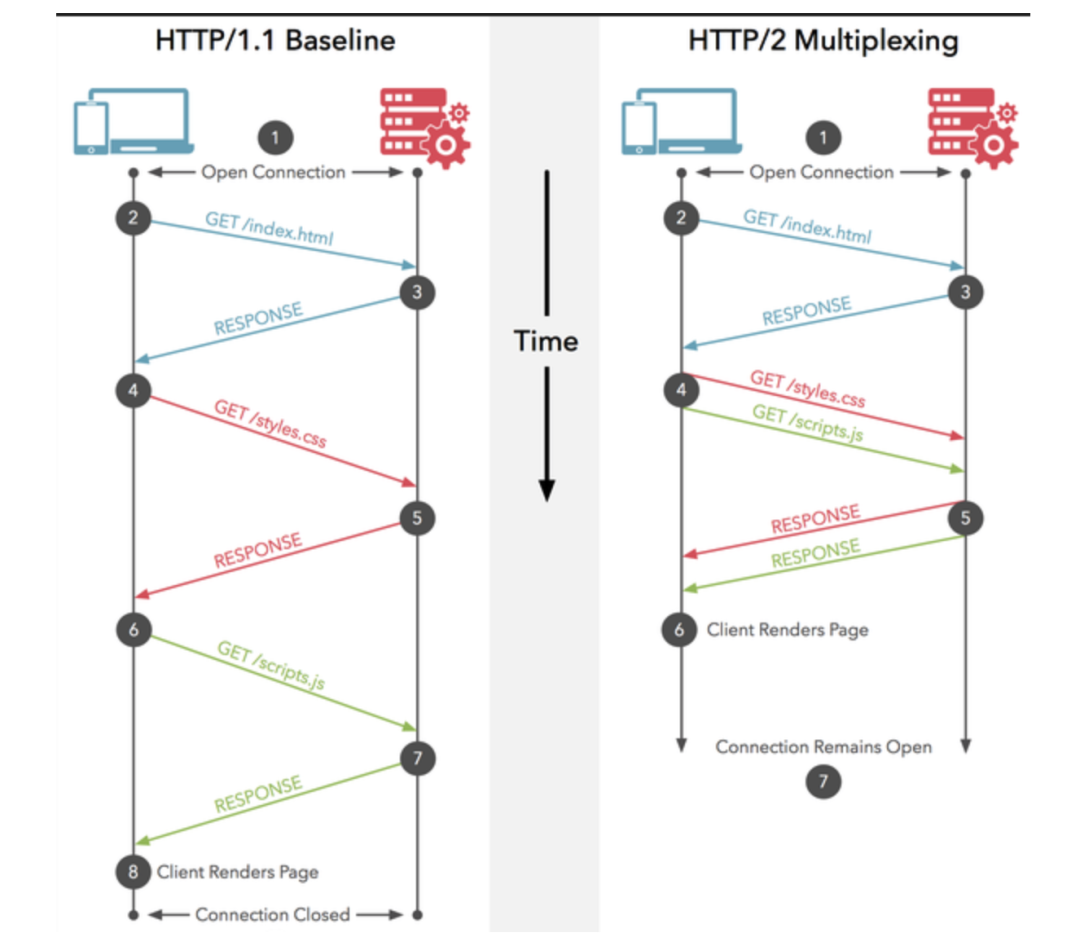 ,由于安全已经成为重中之重,所以 HTTP2.0 一般都跑在 HTTPS 上。多路复用