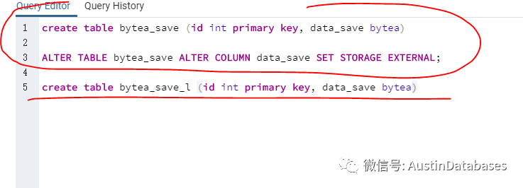 首先我们创建两个表一个表使用了 storage external 的方式来存储我们的data_save字段, 另一个我们采用本身PG的方式来存储我们看看有什么不同
