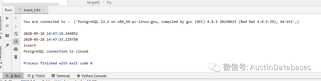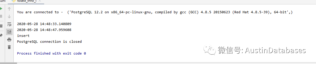 #!/usr/bin/python3# -*- coding: utf-8 -*-import psycopg2import sysimport fileinputfrom psycopg2 import Errorimport datetimedef target(): f = open("H:/app1.csv", mode='rb', buffering=0) read_block = f.read() try: #捕捉连接中的错误 #连接数据库 connection = psycopg2.connect(user = "admin",password="1234.com",host="192.168.198.100",port="5432",database = "test") #获得连接产生cursor cursor = connection.cursor() #执行API中的方法 print (connection.get_dsn_parameters(),"\n") #通过游标来执行SQL语句并传到数据库 cursor.execute("SELECT version();") #取第一行记录 record = cursor.fetchone() print("You are connected to - ", record,"\n") print(datetime.datetime.now()) cursor.execute("INSERT INTO bytea_save_l (id,data_save) VALUES (2,%s)", (psycopg2.Binary(read_block),)) print(datetime.datetime.now()) print ('insert') f.close() except (Exception, psycopg2.DatabaseError) as error: print("Error while creating PostgreSQL table", error) #如果有错误,则捕捉然后打印错误,这里是无法连接时报错 except (Exception, psycopg2.Error) as error : print ("Error while connecting to PostgreSQL", error) #在使用完毕后,关闭连接 finally: #closing database connection. if(connection): cursor.close() connection.close() print("PostgreSQL connection is closed")if __name__ == '__main__': target()