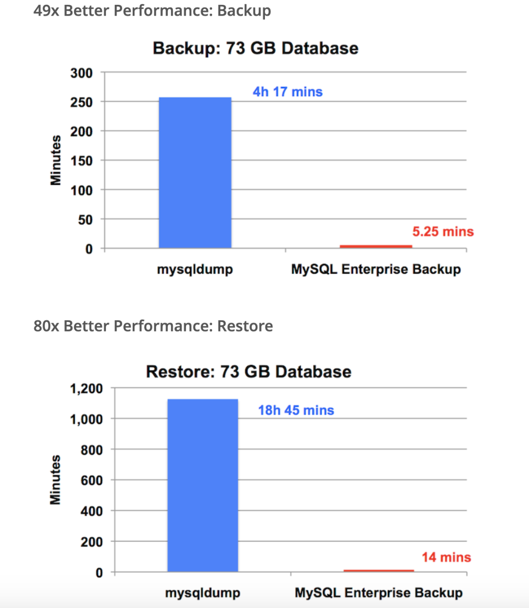 MEB是一款跨平台的高效备份工具,它支持在线”热“备份,增量备份、差异备份、部分备份、压缩备份等一系列主流的备份功能。MySQL Enterprise Backup在优化了InnoDB表备份的同时,还能够备份和恢复MySQL支持的各种存储引擎创建的表。读写过程可以由多个线程独立并行进行,并且,不同的线程可以对单个文件的不同块进行读取、写入处理,使得备份和恢复过程快速执行,相对于逻辑备份工具mysqldump有着显著的性能提升。