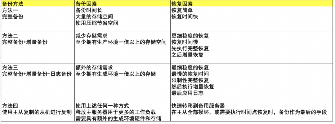 除了上述方法,备份还需要考虑备份时长、恢复时长、恢复级别、存储要求及存储的限制等因素。综合考虑后,制定适合自己的备份策略。