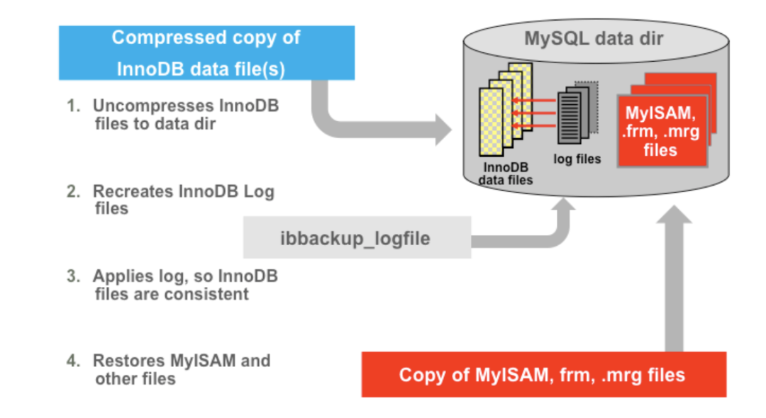 恢复数据库首先将InnoDB文件解压缩到data目录。MySQL Enterprise Backup重新创建InnoDB日志文件,并应用这些日志,以使InnoDB文件恢复到一致的状态,然后恢复MyISAM数据。