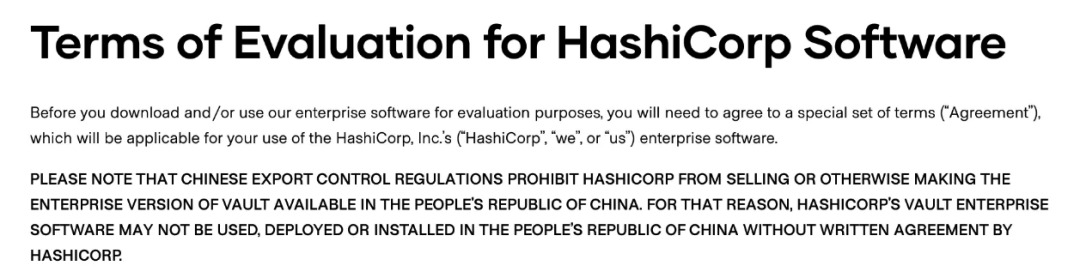 他的创始人,表示实际上这与开源软件无关,而是只限制Vault企业版产品,并且原因是Vault产品目前使用的加密算法,在ZG不符合法规,另一方面是MG出口管制法在涉及加密相关软件上也有相应规定。因此这两项原因使得HashCorp不得不在声明中说明风险。该公司的法律团队已对条款进行了更明确的更新,也就是目前我们看到的版本。按照目前HashiCorp官网上的声明,开源项目其实还是“安全”的,被禁用的是Vault企业版。