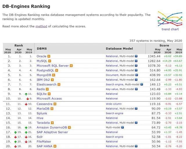 DB-Engines数据库流行度2020年5月排行榜,排在前列的大多是国外厂商,