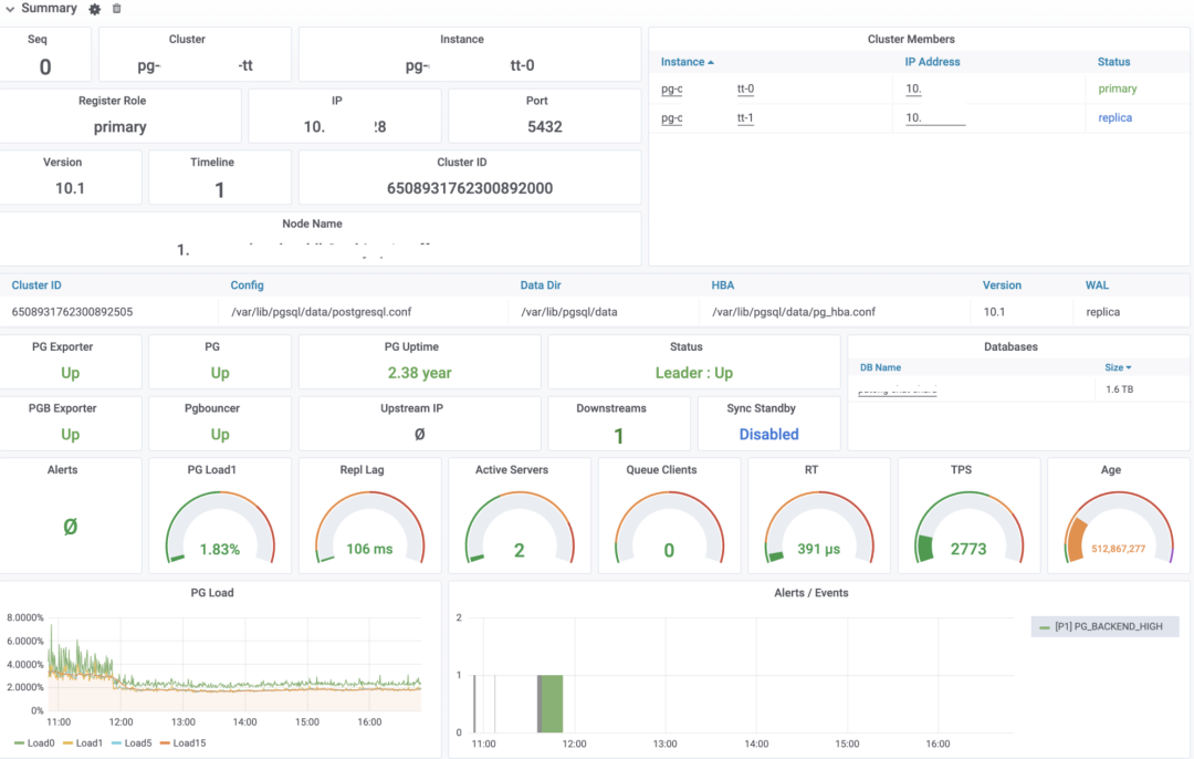 实例身份信息:集群名,ID,所属节点,软件版本,所属集群其他成员等 实例配置信息:一些关键配置,目录,端口,配置路径等 实例健康信息,实例角色(Primary,Standby)等。 黄金指标:PG Load,复制延迟,活跃后端,排队连接,查询延迟,TPS,数据库年龄 数据库负载:实时(Load0),1分钟,5分钟,15分钟 数据库警报与提醒事件