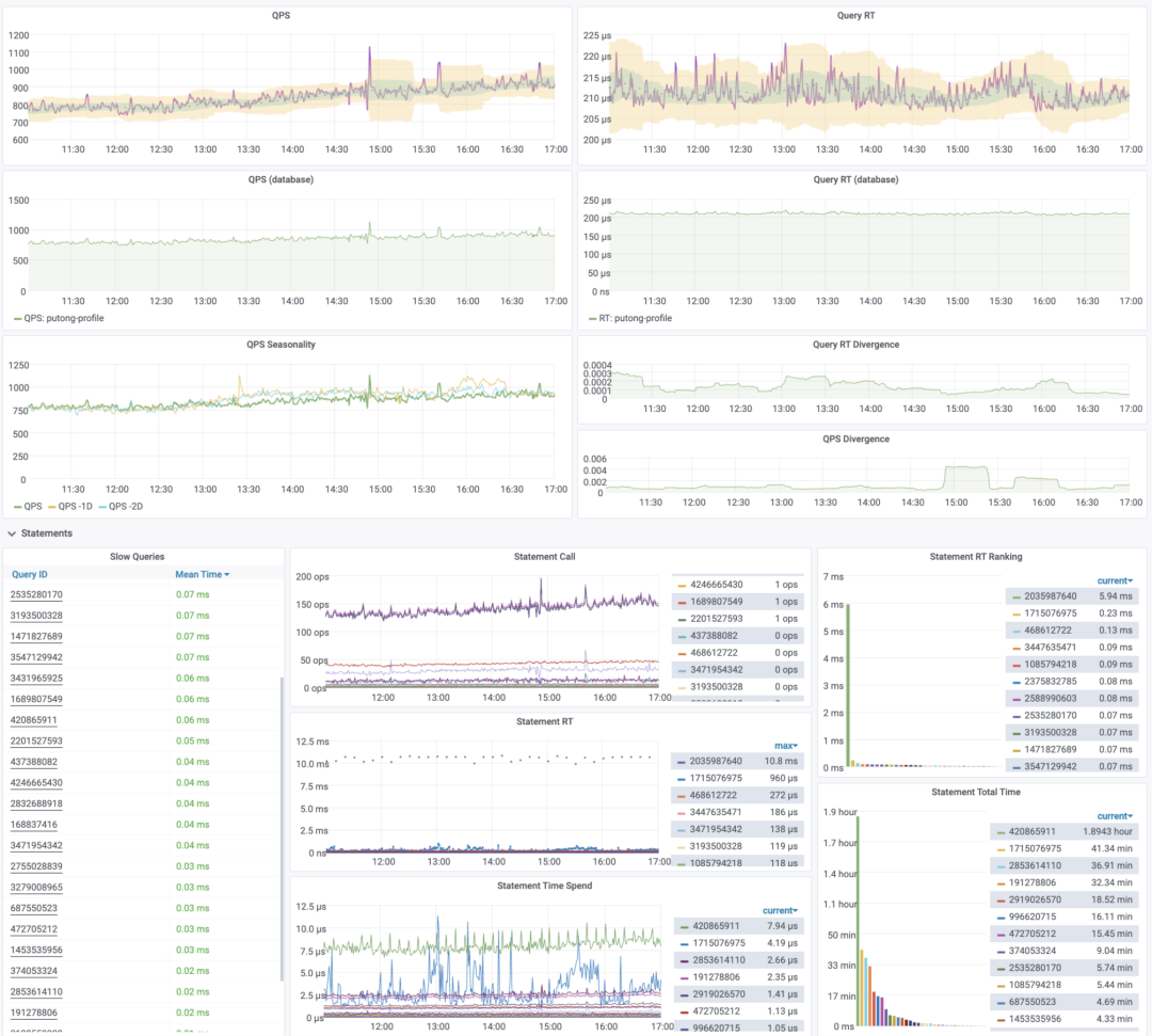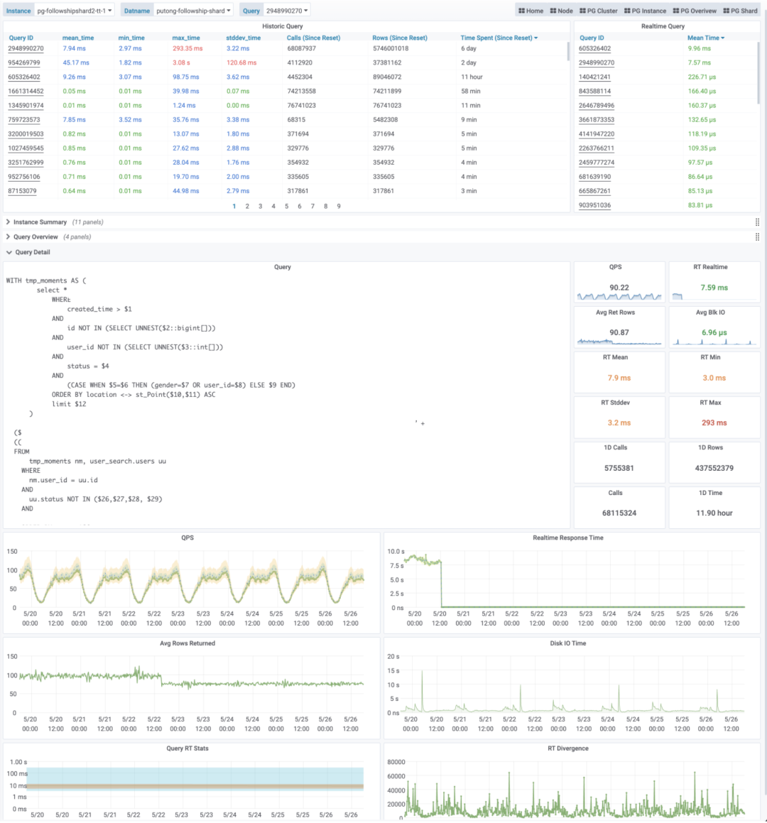 左侧是格式化后的查询语句,右侧是查询的主要指标,包括 每秒查询数量:QPS 实时的平均响应时间(RT Realtime) 每次查询平均返回的行数 每次查询平均用于BlockIO的时长 响应时间的均值,标准差,最小值,最大值(自从上一次统计周期以来) 查询最近一天的调用次数,返回行数,总耗时。以及自重置以来的总调用次数。 下方是指定时间段的查询指标图表,是概览指标的细化。