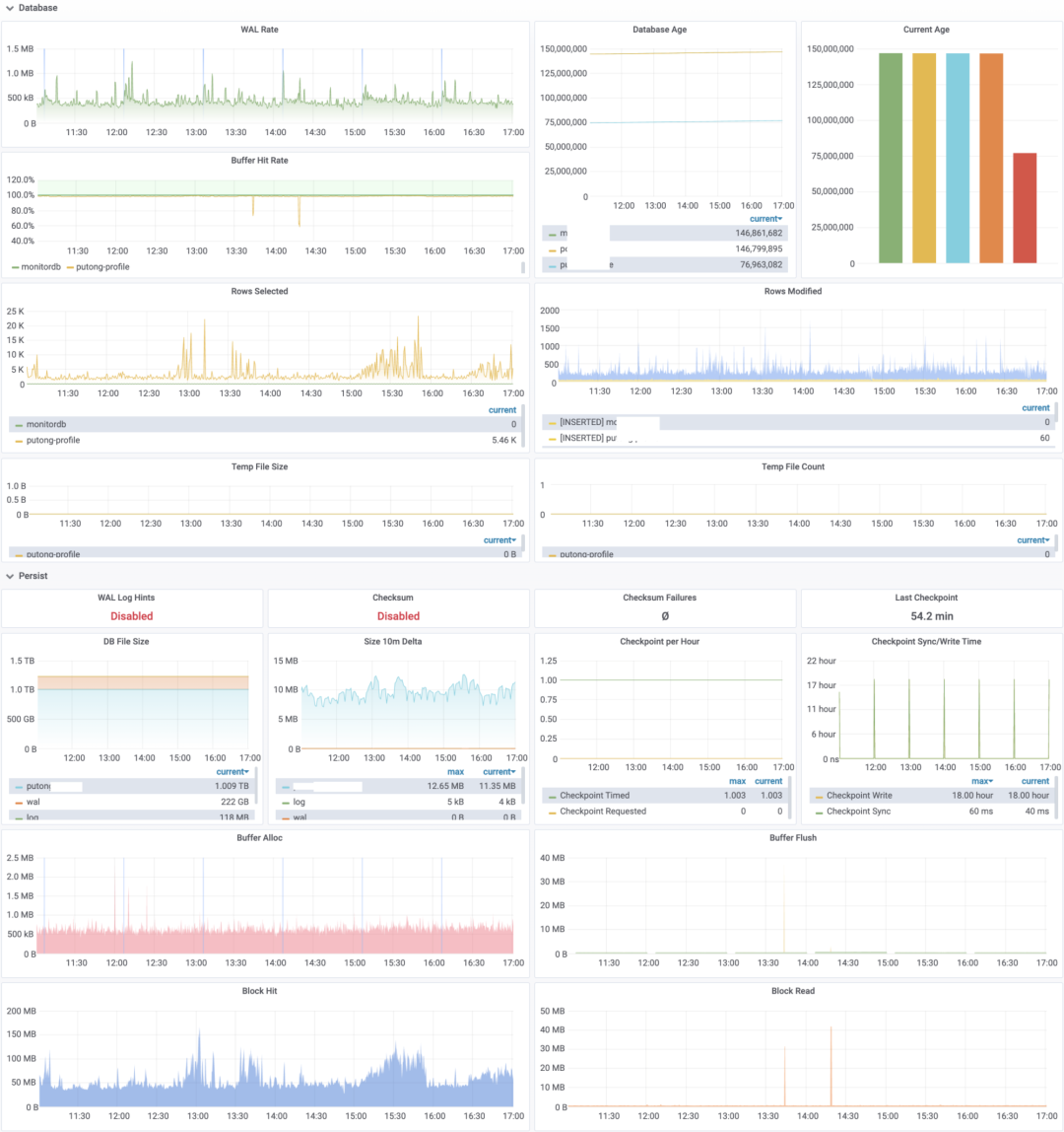 重要的持久化参数,比如是否出现数据校验和验证失败(如果启用可以检测到数据腐坏) 数据库文件(DB,WAL,Log)的大小与增速。 检查点的数量与检查点耗时。 每秒分配的块,与每秒刷盘的块。每秒访问的块,以及每秒从磁盘中读取的块。(以字节计,注意一个Buffer Page是8192,一个Disk Block是4096)