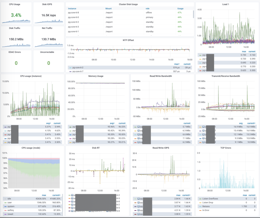 PG Load, Node Load CPU使用,内存使用,磁盘使用,网卡带宽利用率,缓存命中率,后端连接使用,连接池使用